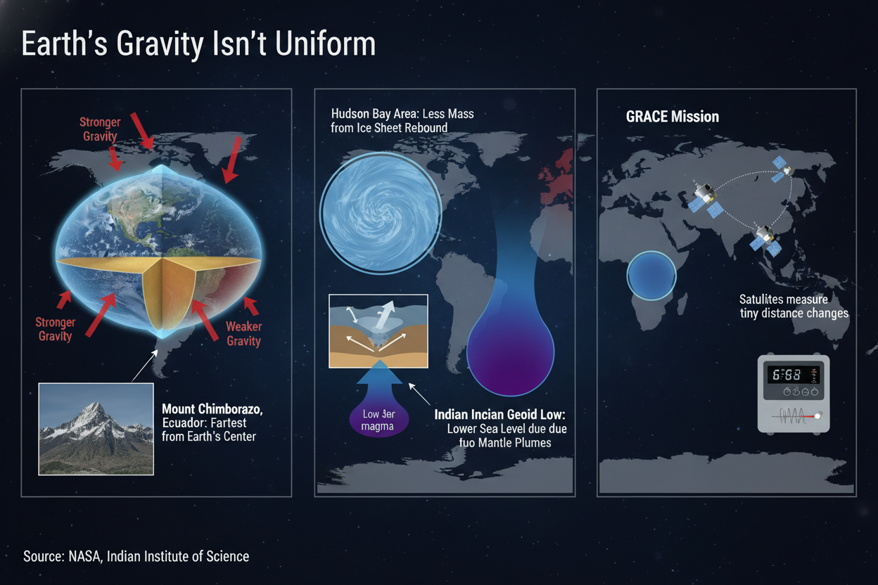 Perhaps the most dramatic gravity anomaly on the planet is a vast “gravity hole” in the Indian Ocean, just south of the tip of India. Known as the Indian Ocean Geoid Low (IOGL), it is a massive area where the gravitational pull is much weaker than average.